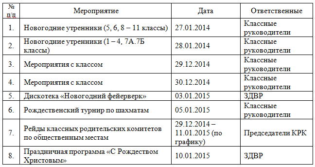 График рейдов по общественным местам. На основании Решения Общешкольного родительского комитета от 09.12.2014г. составлен график рейдов по посёлку и общественным местам (детская площадка, кафе и др.) КРК (классных родительских комитетов) в празднично-каникулярное время с 21.00 до 22.00 часов: 29.12.2014г. – 7 «Б» класс; 30.12.2014г. – 6 класс; 31.12.2014г. – 3 «Б» класс, 10 класс; 01.01.2015г. – 2 «Б» класс, 11 класс; 02.01.2015г. – 3 «А» класс; 03.01.2015г. – 8 «А» класс; 04.01.2015г. – 4 класс; 05.01.2015г. – 7 «А» класс; 06.01.2015г. – 2 «А» класс; 07.01.2015г. – 9 «А» класс; 08.01.2015г. – 5 класс; 09.01.2015г. – 9 «Б» класс; 10.01.2015г. – 1 класс; 11.01.2015г. – 8 «Б» класс.
