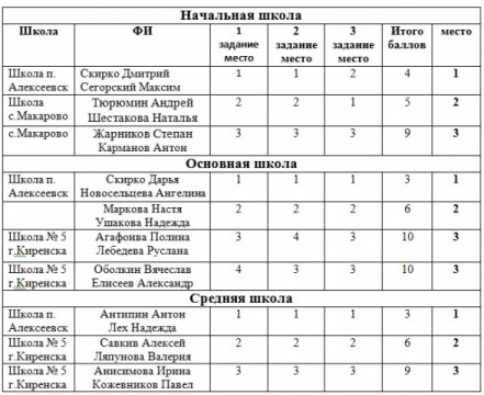 В данной игре победителями вышли: старшая школа – Антипин Антон и Лех Надежда, средняя школа – Скирко Дарья и Новосельцева Ангелина, в младшей школе – Тюрюмин Андрей и Шестакова Наталья. Они и представят Киренский район на областном чемпионате.