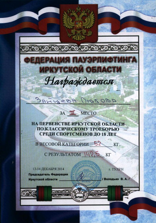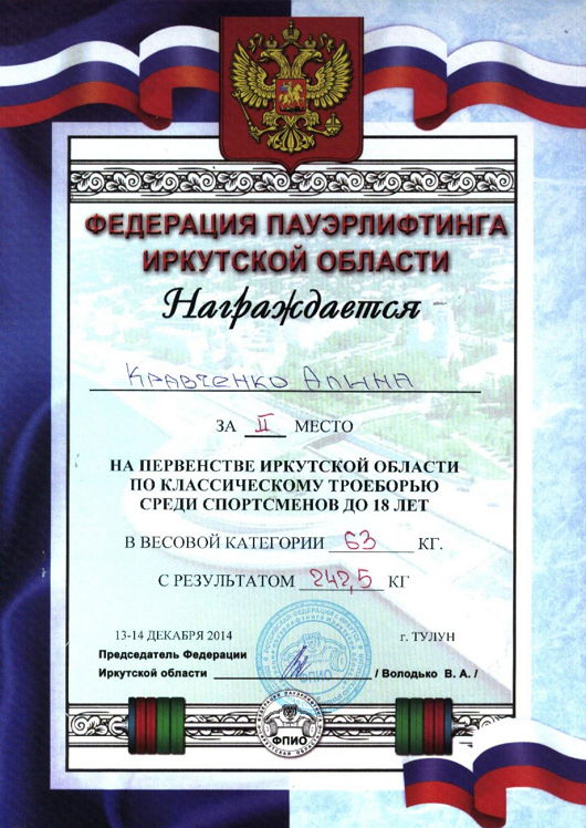 С 13 по 14 декабря 2014 года в городе Тулуне проходило первенство Иркутской области по классическому пауэрлифтингу, в котором успешно выступили наши девчонки. Поздравляем Кравченко Алину, занявшую второе место в весовой категории 63 кг. С результатом 242,5 кг!
