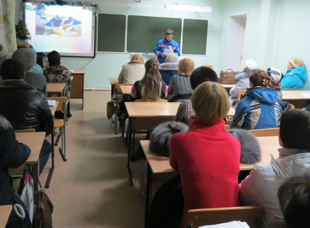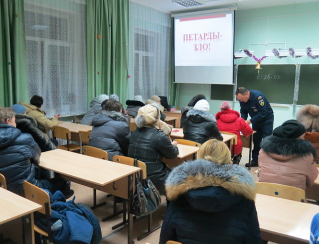 Начальник караула ПЧ – 153 Шубин Е.В. проводит беседу для родителей на родительском собрании во 2Б, 3А и 8А классах.