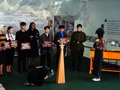 Эмоционально «взорвали» зрителей ученики 7-Б класса: Рябошапка Денис, Селиванов Михаил, Александриков Дмитрий, Кривошеев Илья, Макарова Дарья, Новосельцева Ангелина, Гартнер Виктория, Владимирова Екатерина, Анкудинова Кристина, Потапова Кристина. Вместе с классным руководителем Еленой Иннокентьевной Зарукиной они подготовили сцены из повести «Деревянные кони». Война забрала почти всех мужчин из деревни Васильевки. Женщины, старики и дети устанавливают им памятник, и главный герой Колька «постигает горе целой деревни»: «Я содрогнулся. Первый раз в жизни я видел такое горе. Горе не одного человека, не двоих, не одной семьи, а горе целой деревни».